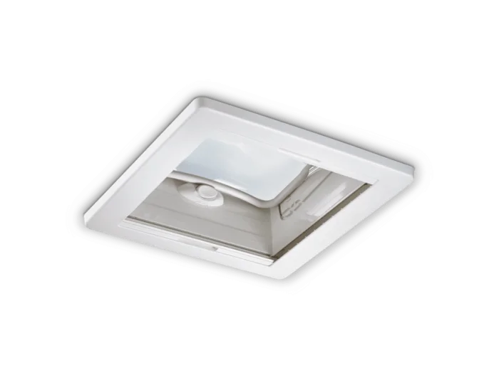 Dôme de toit 400 x 400 mm en verre acrylique double vitrage légèrement teinté à forme aérodynamique. S'adapte parfaitement aux découpes de toit standard 400 x 400 mm de camping-cars et caravanes. L'angle d'ouverture est déterminé par un levier de manœuvre. Cadre interne avec store occultant et moustiquaire (manœuvrables indépendamment l'un de l'autre). Angle maximal d'ouverture : 50°. 3 positions d'ouvertures (avec position mauvais temps). Kit de cales de montage inclus.