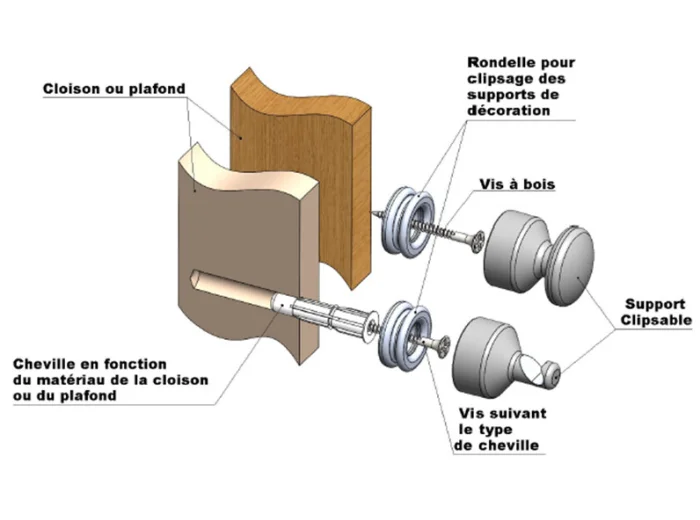 - Pour une fixation sur cloisons fines (cloisons et portes intérieures) : fixation multimatériaux avec vis autoforeuse (8mm)