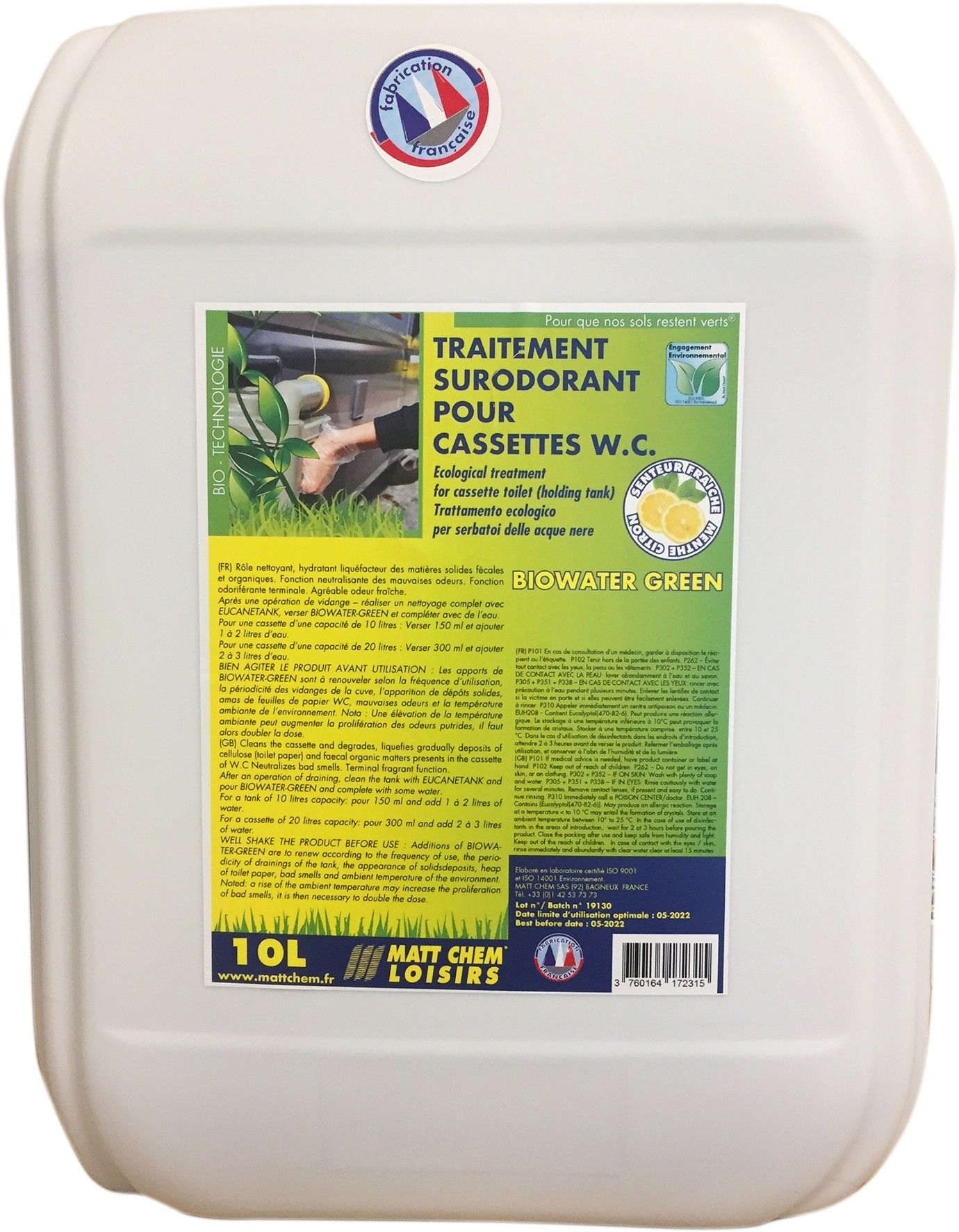 BIEN AGITER LE PRODUIT AVANT UTILISATION : Les apports de BIOWATER-GREEN sont à renouveler selon la fréquence d’utilisation, la périodicité des vidanges de la cuve, l’apparition de dépôts solides, amas de feuilles de papier WC, mauvaises odeurs et la température ambiante de l’environnement.